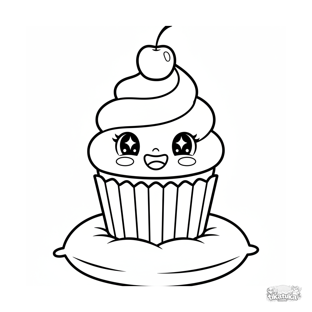 Página para colorir divertida para crianças pequenas: um cupcake sorridente com uma cereja senta-se em um travesseiro. Formas grandes e simples, imagem reconhecível.