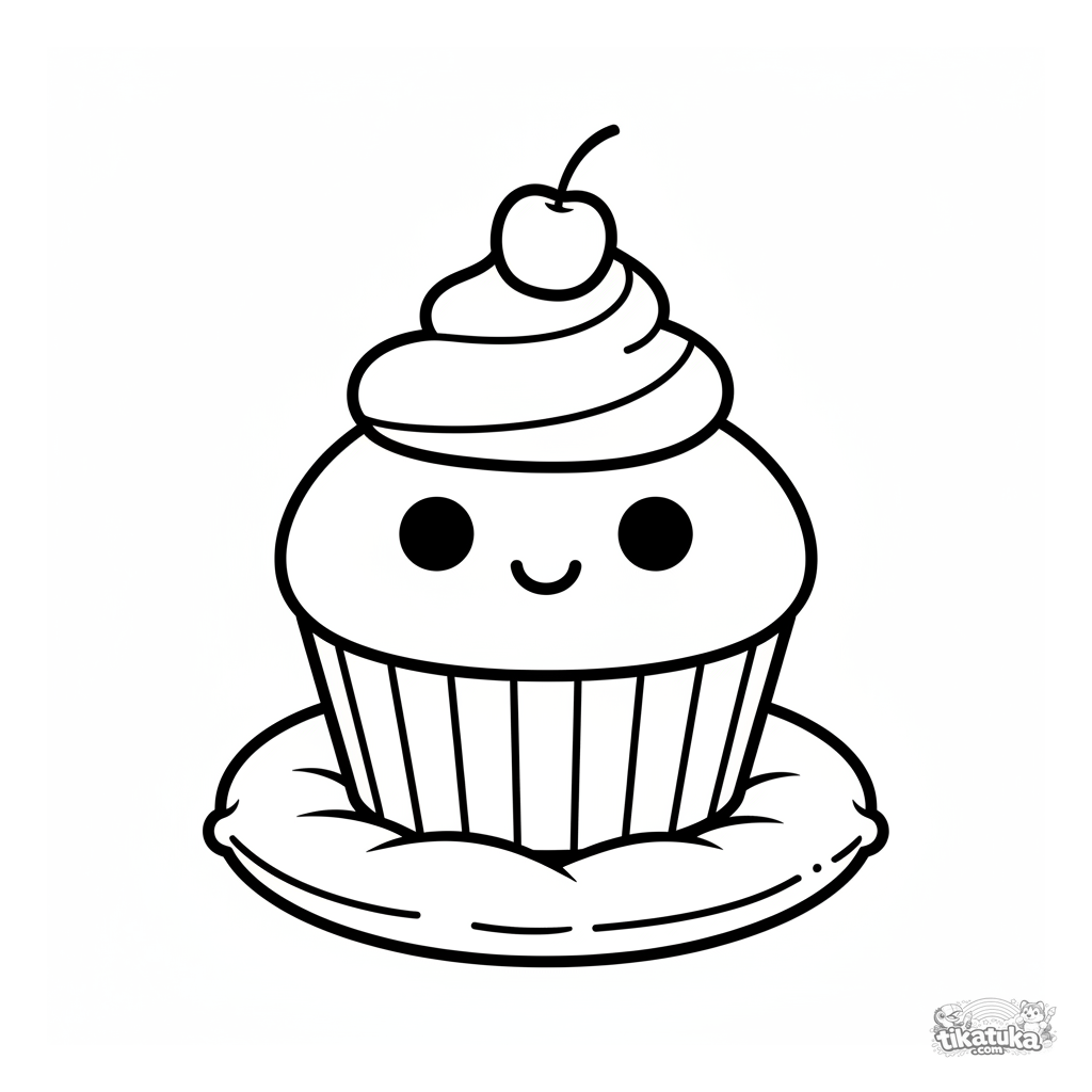 Página para colorir para 2-3 anos: um cupcake sorridente com uma cereja sentado em um travesseiro macio. Formas muito simples e grandes para colorir pela primeira vez.