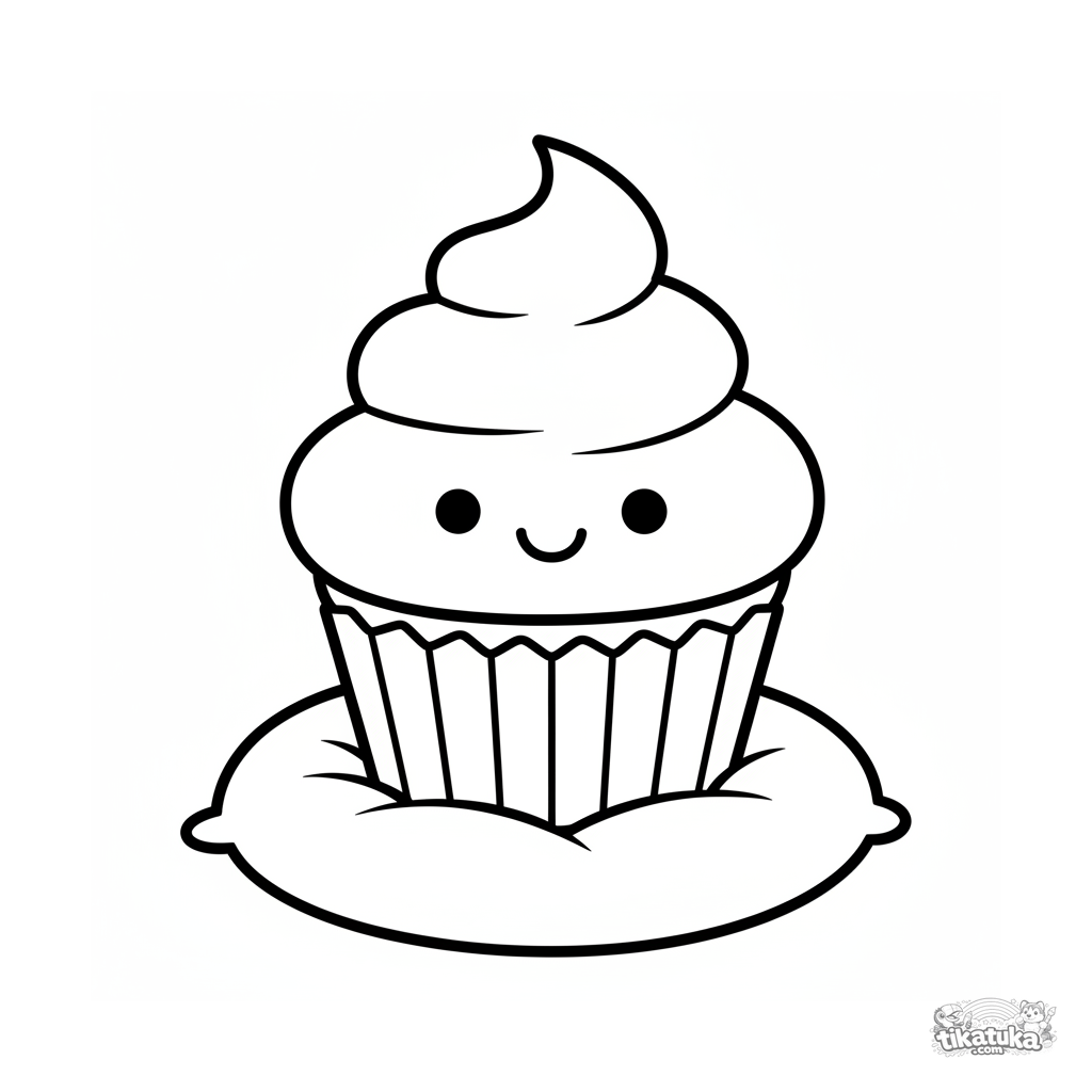 Página para colorir fofa para bebês: um cupcake sorridente com rosto sentado em um travesseiro fofinho. Formas muito simples e grandes.