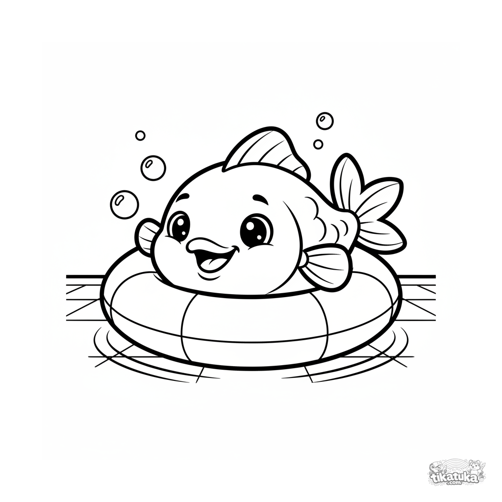 Página para colorir para crianças de 4 a 6 anos: um peixe sorridente brinca de esconde-esconde, espiando de um anel inflável no fundo da piscina.