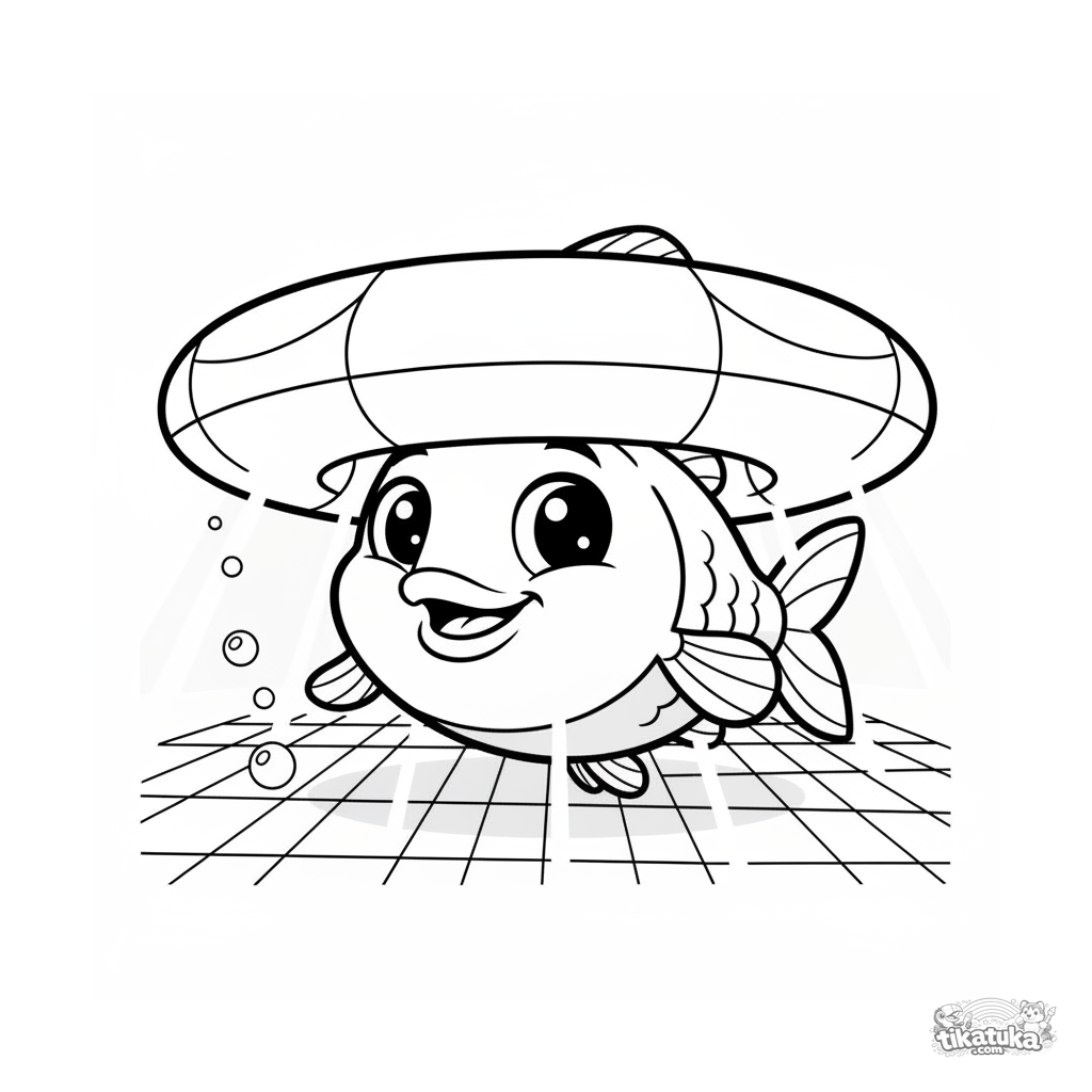 Página para colorir para crianças 4-6: um peixe sorridente e alegre no estilo cartoon dos anos 90 brinca de esconde-esconde sob um anel inflável. Emoções vivas, formas simples.