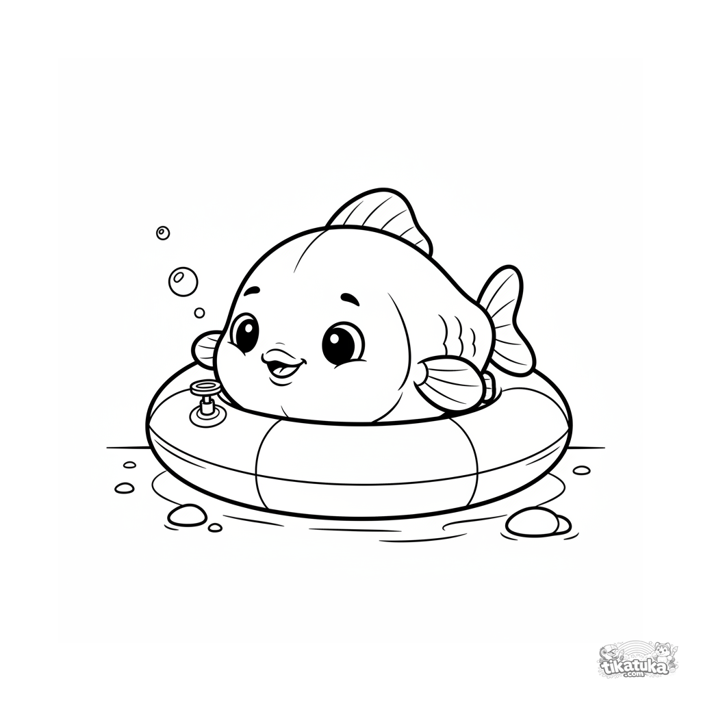 Página para colorir para crianças de 7-9 anos: um peixe sorridente nada ao longo de uma boia inflável no fundo da piscina, inspecionando-a com curiosidade. Contornos claros, rosto expressivo.