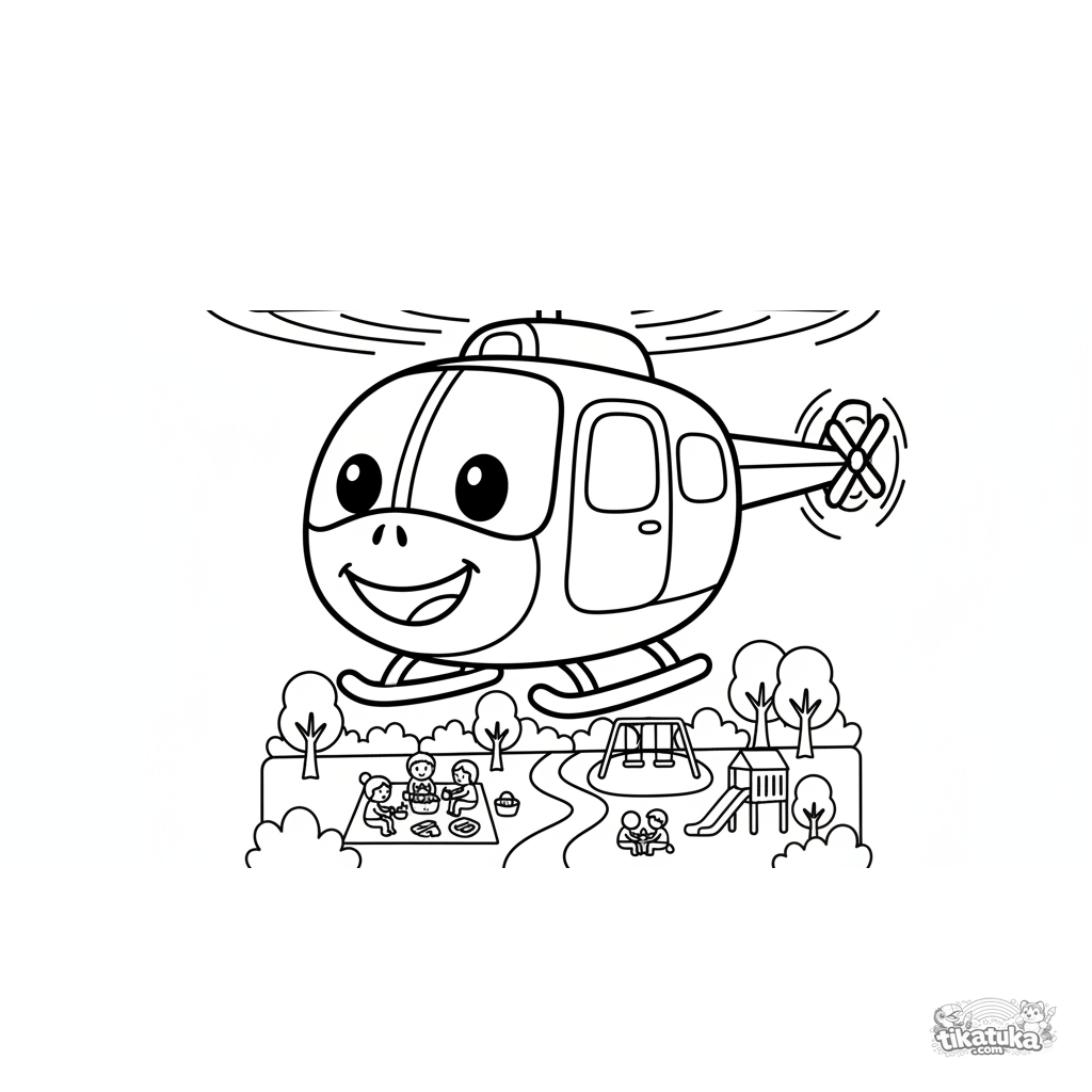 Página simples para colorir para crianças pequenas 2-3: um helicóptero feliz com rosto pairando sobre um parque. Formas grandes, contornos grossos, muito espaço em branco.