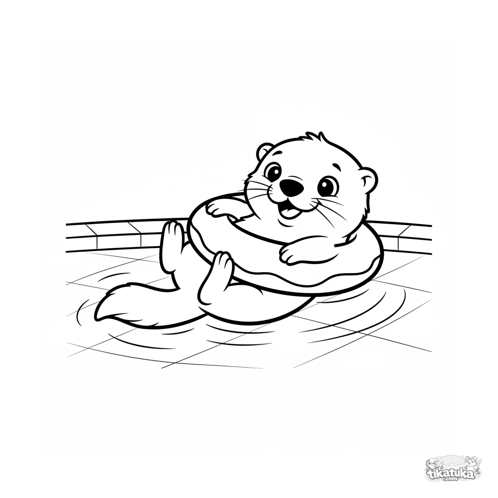 Página simples para colorir para bebês: um filhote de lontra boiando de costas abraçando uma boia. Para crianças de 2 a 3 anos.