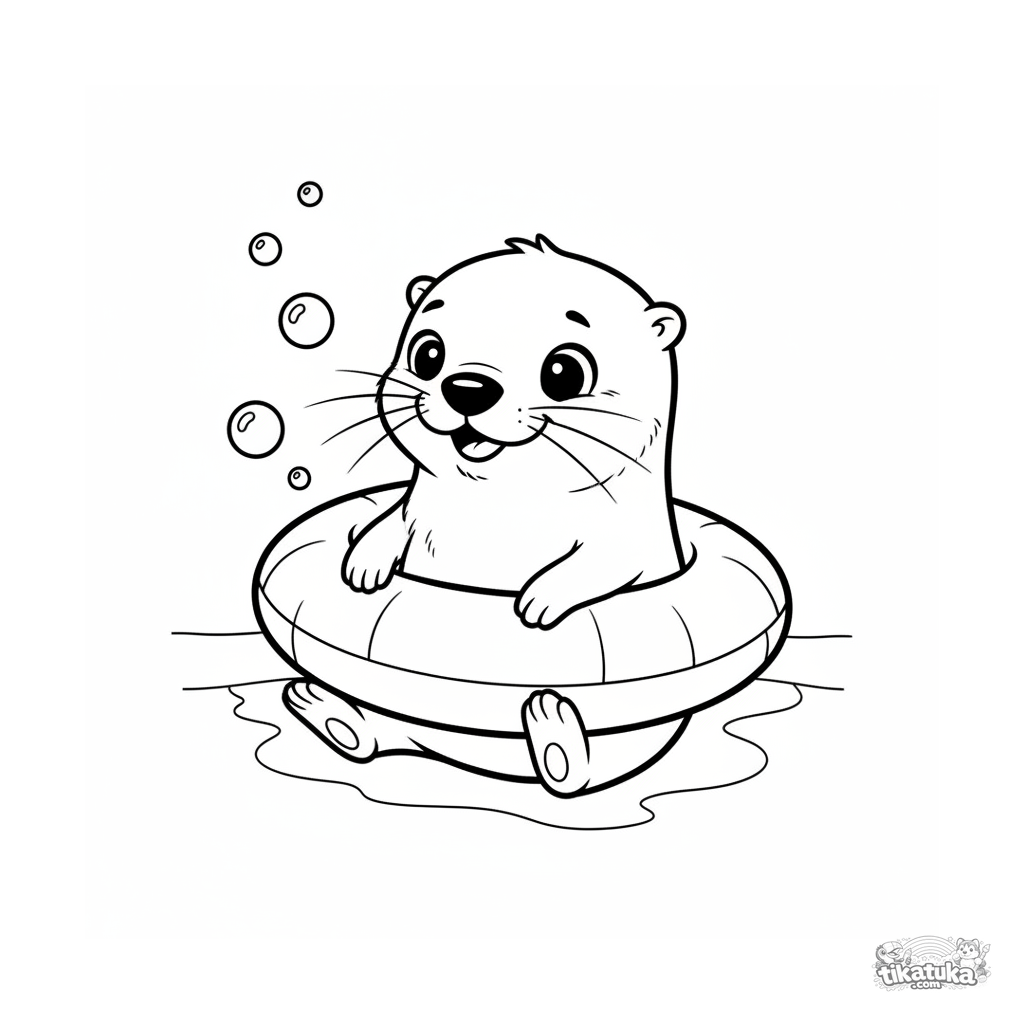 Página para colorir para crianças 4-6 anos: um filhote de lontra alegre rola uma bóia pelo fundo da piscina. Rosto expressivo, fundo simples, estilo amigável de livro infantil.