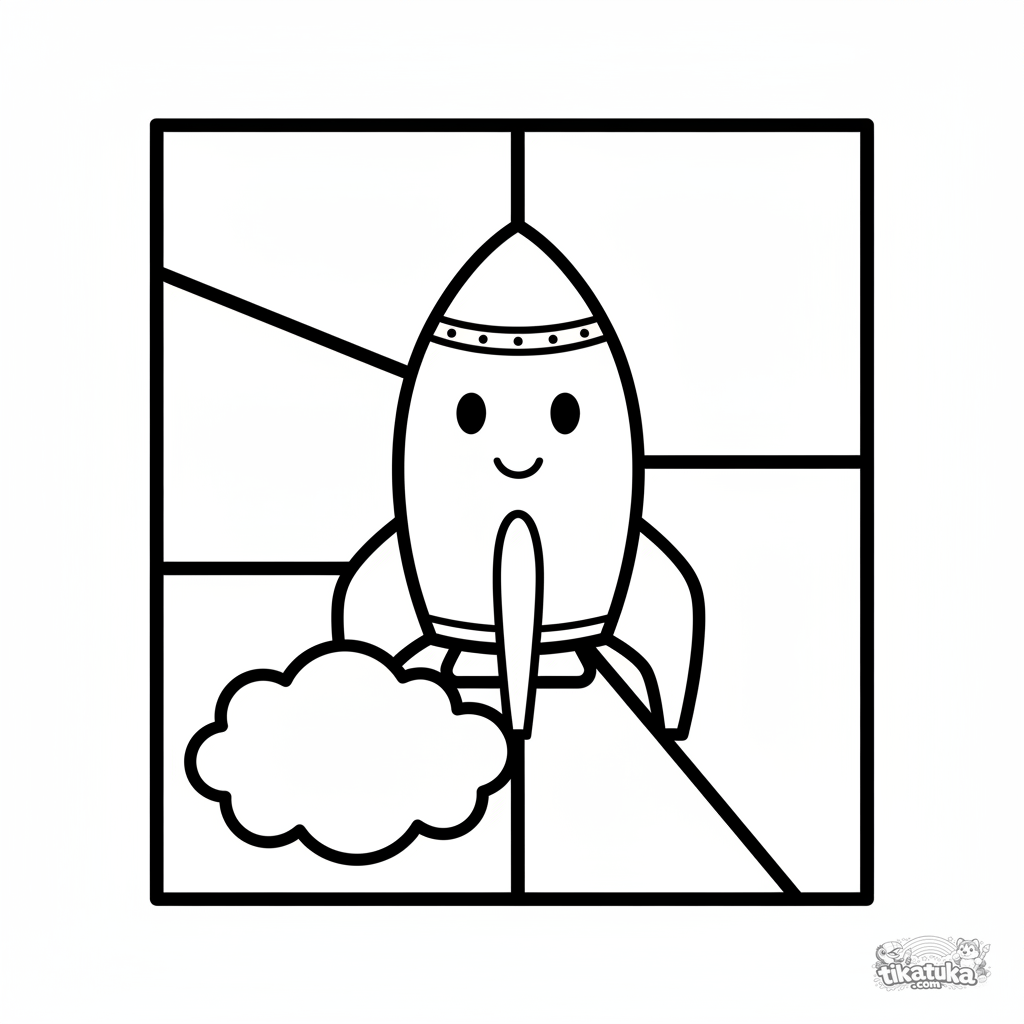 Página para colorir para crianças de 2-3 anos: um foguete amigável e sorridente. Formas muito simples, contornos grossos, áreas grandes para colorir. Página para pintar por números para crianças.