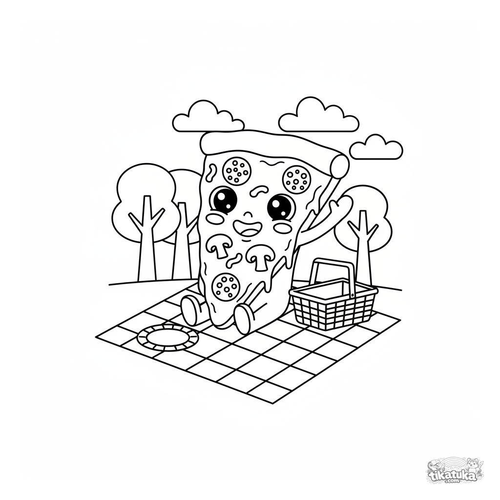 Página para colorir de uma fatia de pizza sorridente em um piquenique. Para crianças de 4 a 6 anos. A pizza com pepperoni e cogumelos senta-se em um cobertor xadrez.