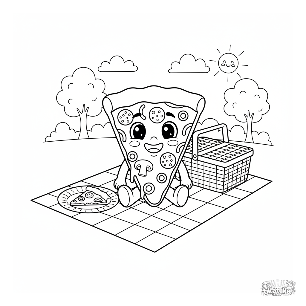 Página para colorir de uma fatia de pizza sorridente num piquenique. Para crianças de 4 a 6 anos.