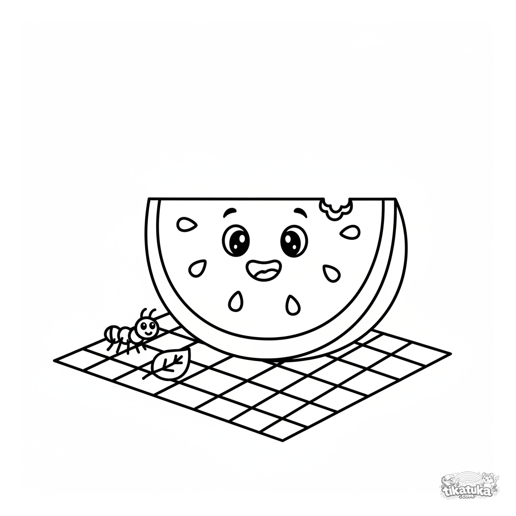 Página simples para colorir para crianças pequenas: uma fatia de melancia sorridente num piquenique. Para 2-3 anos. Formas grandes e simples com sementes.