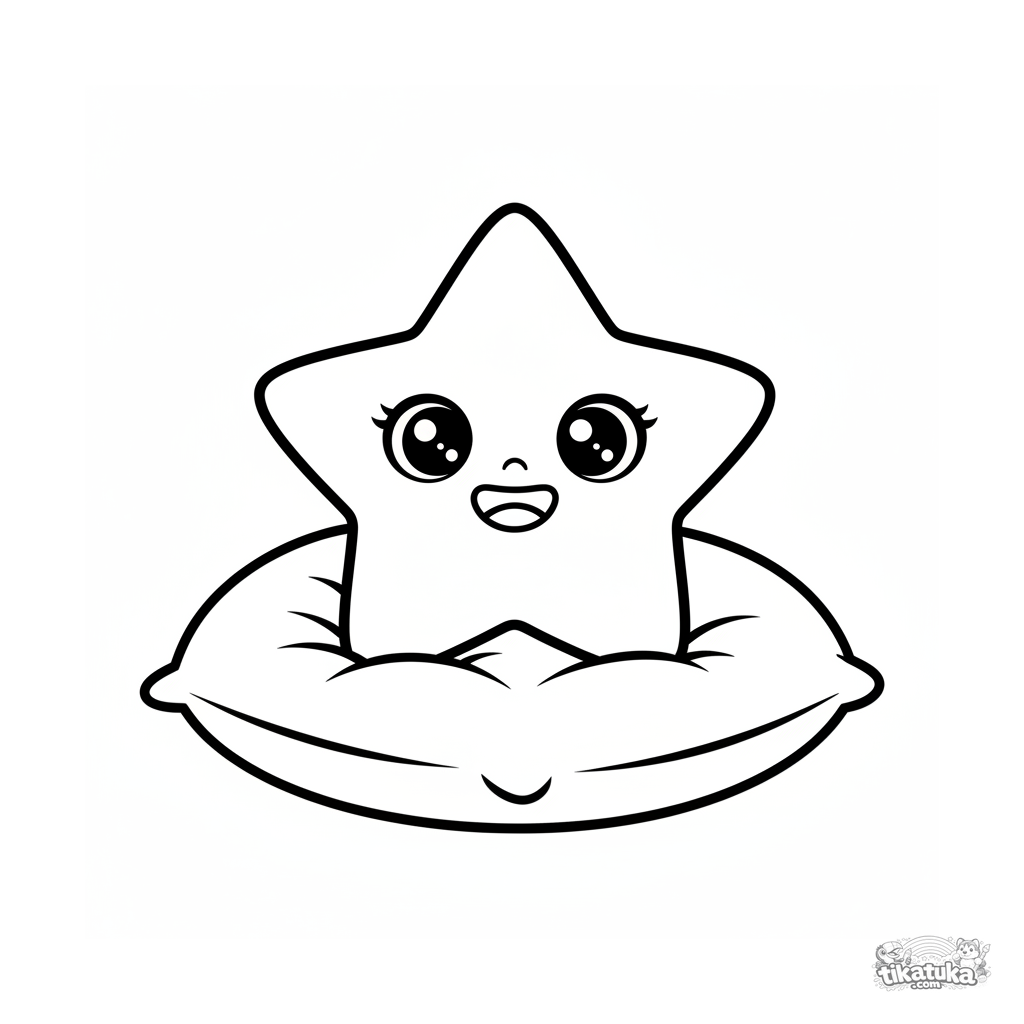 Página para colorir brilhante e simples para 2-3 anos: uma estrela sorridente descansando em uma almofada. Pontas grandes e um rosto gentil, perfeito para primeiros lápis de cor.