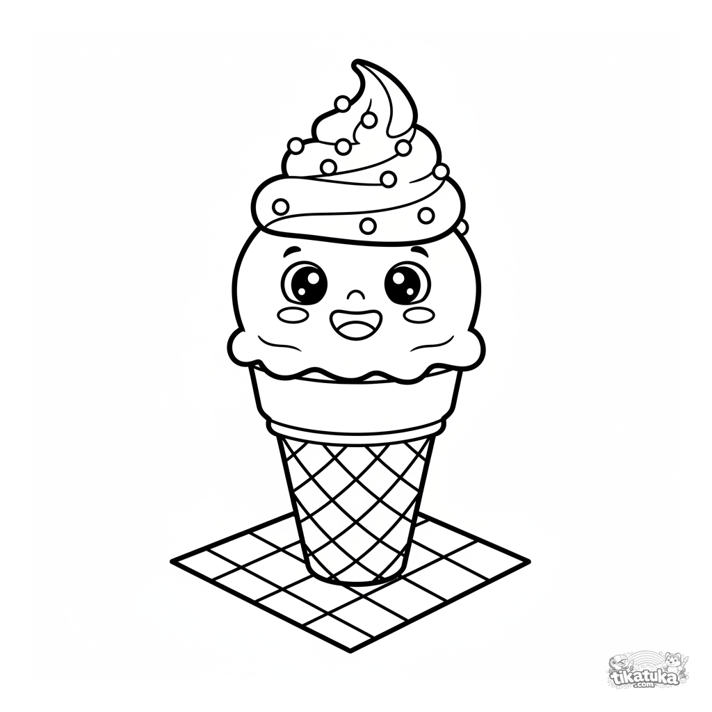 Página para colorir para crianças pequenas de 2-3 anos: um sorvete sorridente simples numa casquinha de waffle com confeitos. Grandes áreas para colorir, muito poucos detalhes.