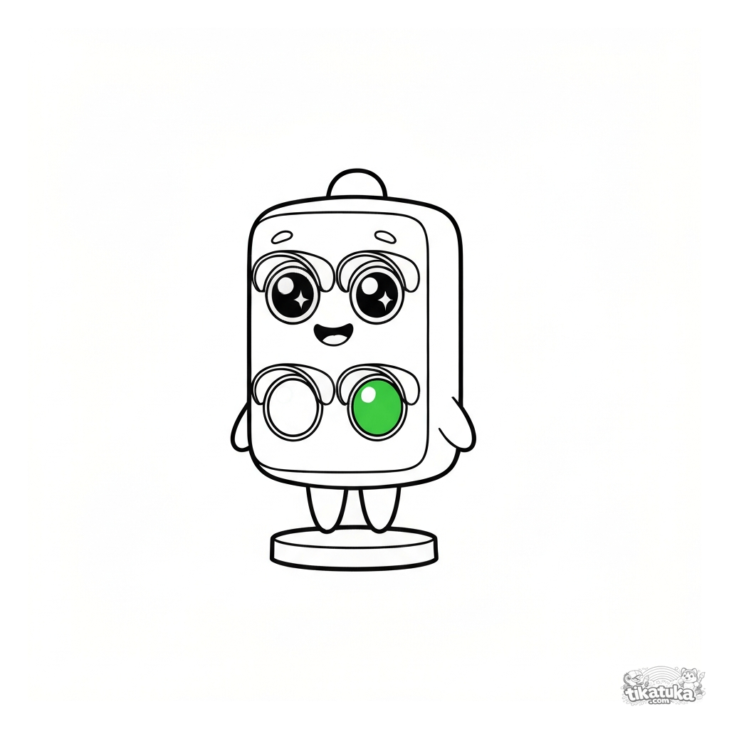 Um semáforo amigável com olhos grandes e um sorriso espera para ser colorido. Uma ótima página para aprender cores e segurança no trânsito!