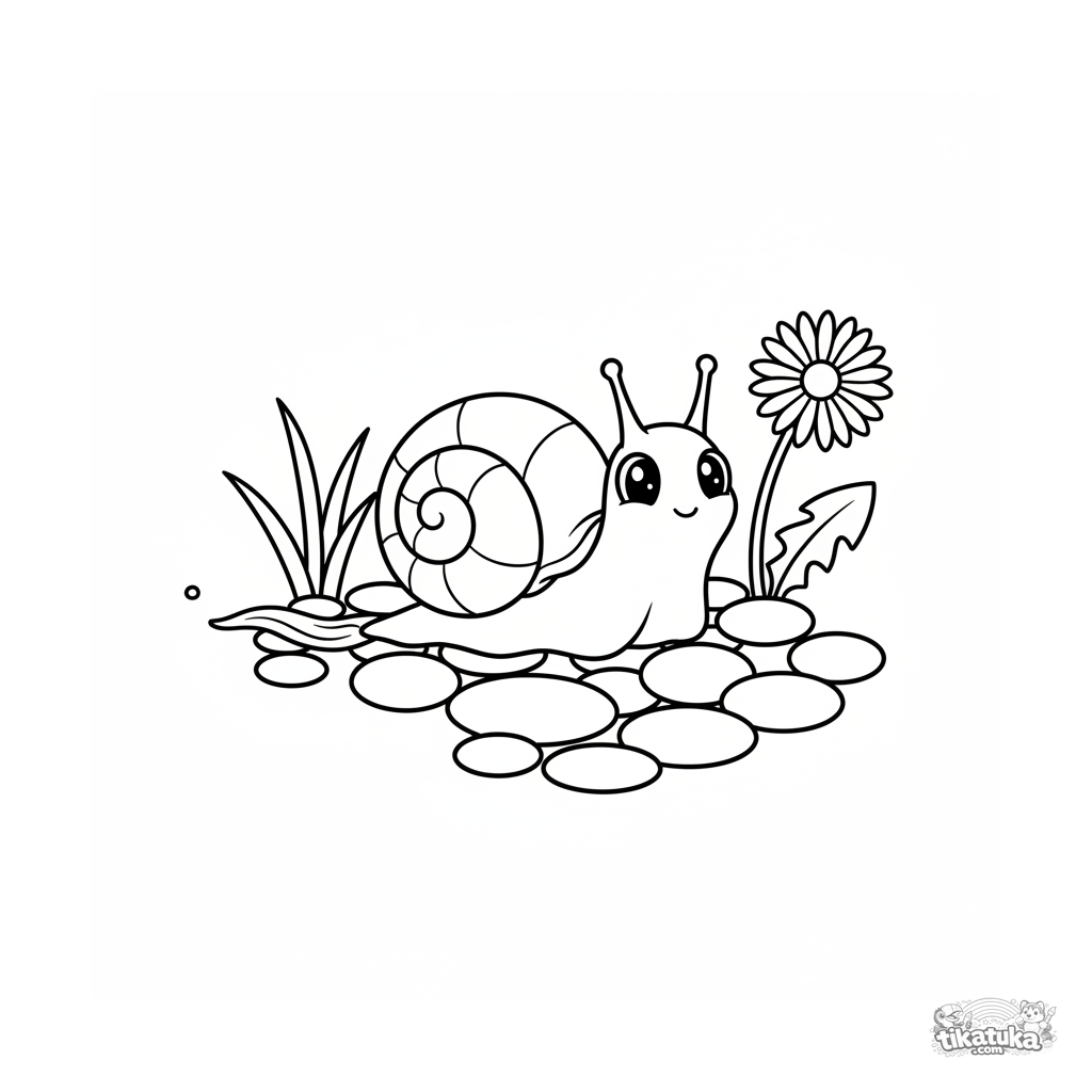 Página para colorir muito simples para bebês de 2-3 anos: um caracol fofo rasteja lentamente por uma trilha de seixos em direção a um riacho claro. Formas grandes e claras, perfeitas para primeiros lápis de cor.