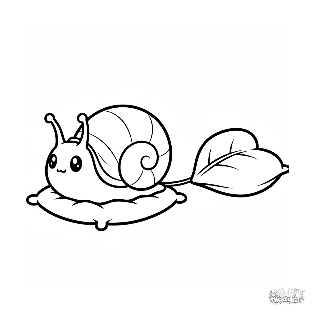 Página kawaii para colorir para crianças de 2-3 anos: um caracol fofo rasteja em uma almofada puxando um travesseiro em forma de folha. Formas arredondadas e suaves.