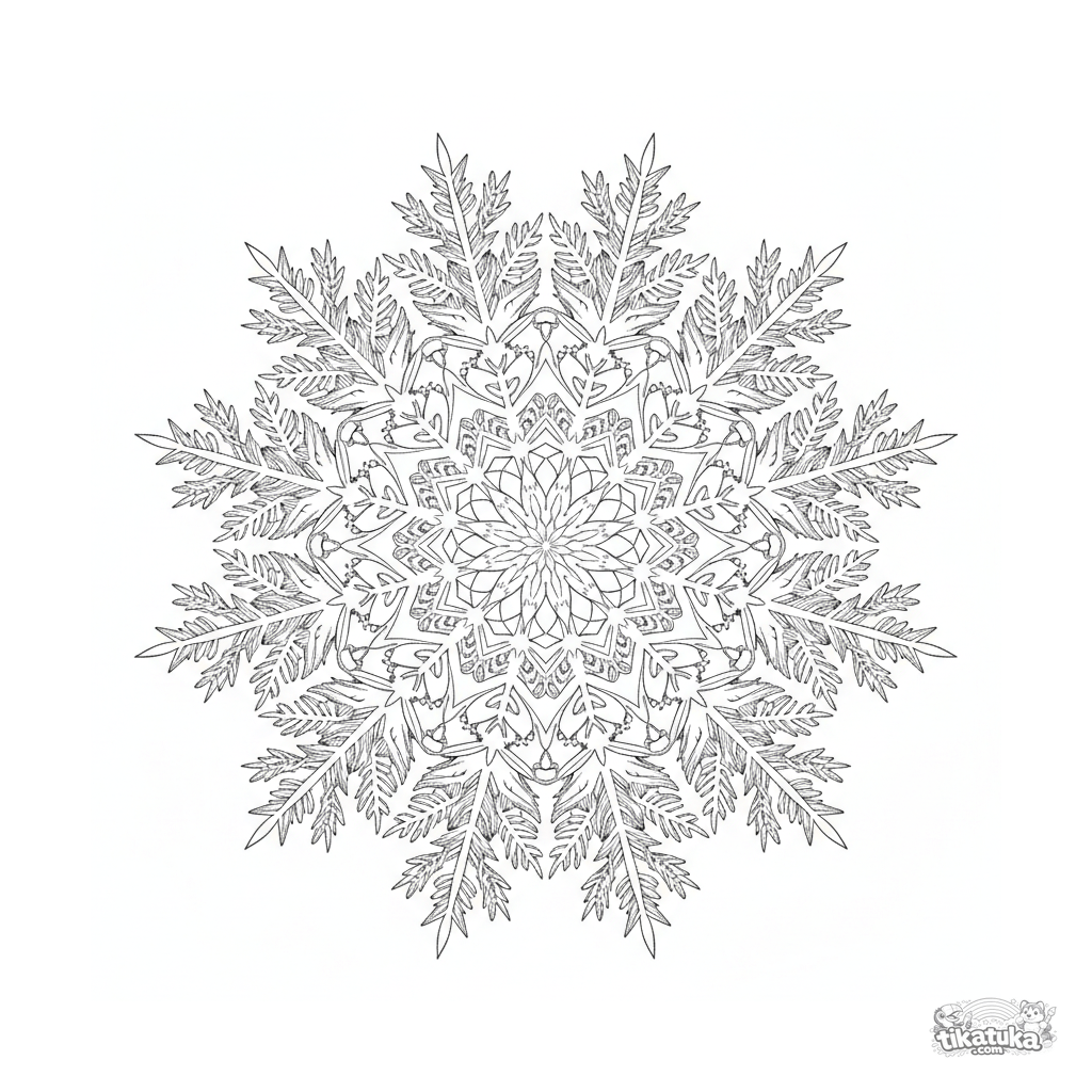 Página para colorir de mandala de floco de neve detalhada com cristais de gelo para crianças de 10 a 12 anos. Simetria hexagonal perfeita e padrões de inverno delicados.