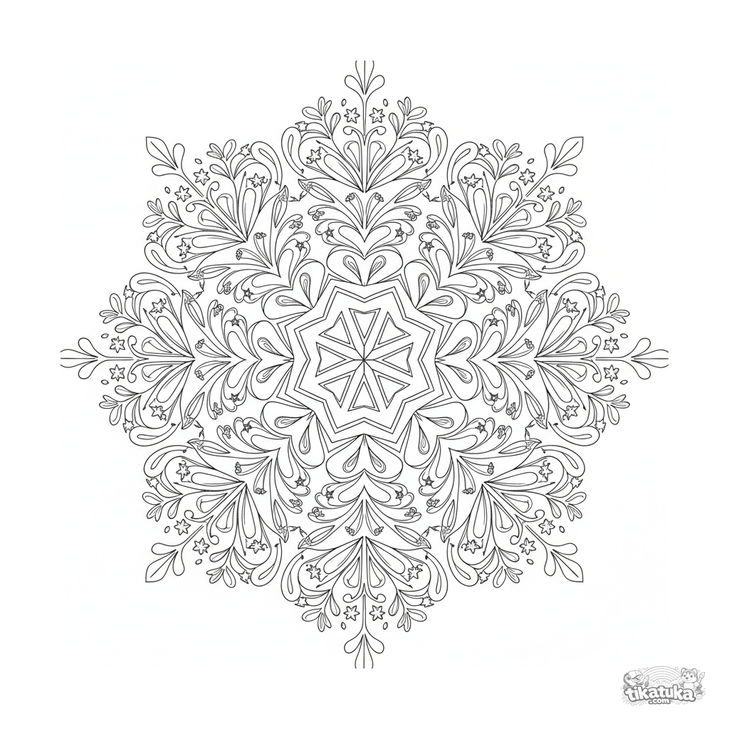 Página para colorir de mandala floco de neve detalhada para 10-12 anos. Cristal de gelo hexagonal central com ramos penugentos intrincados e detalhes estrelados em simetria de seis partes.