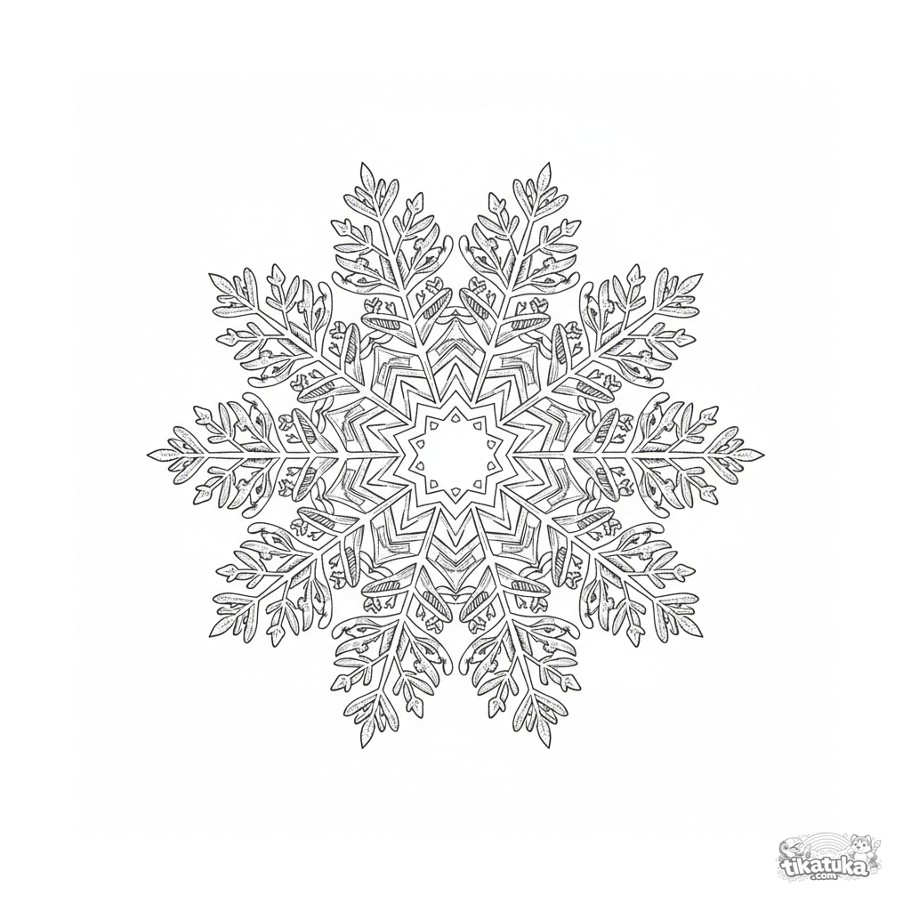 Mandala de floco de neve detalhada para colorir para 10-12 anos. Simetria de seis pontas perfeita com braços cristalinos ramificados.