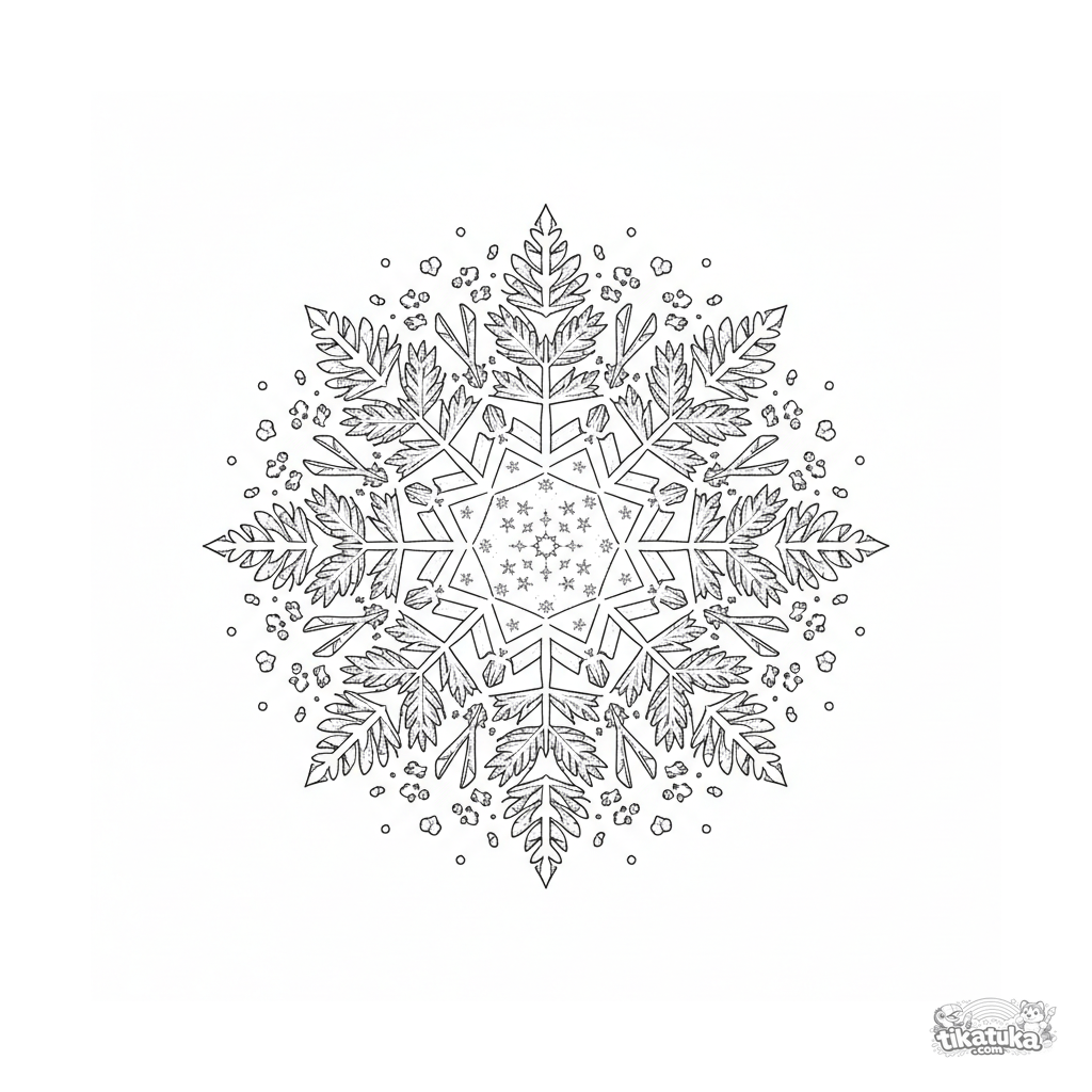Mandala requintada em forma de floco de neve com simetria sextavada. Página para colorir altamente detalhada com cristais de gelo para idades 10-12.