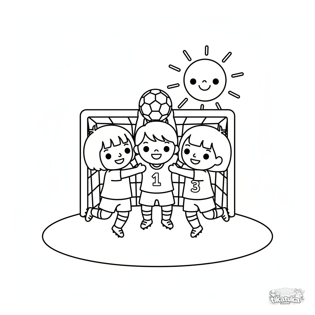 Página para colorir para crianças pequenas 2-3: um time de futebol feliz de crianças pulando de alegria após marcar um gol. Cena simples com formas grandes e claras.