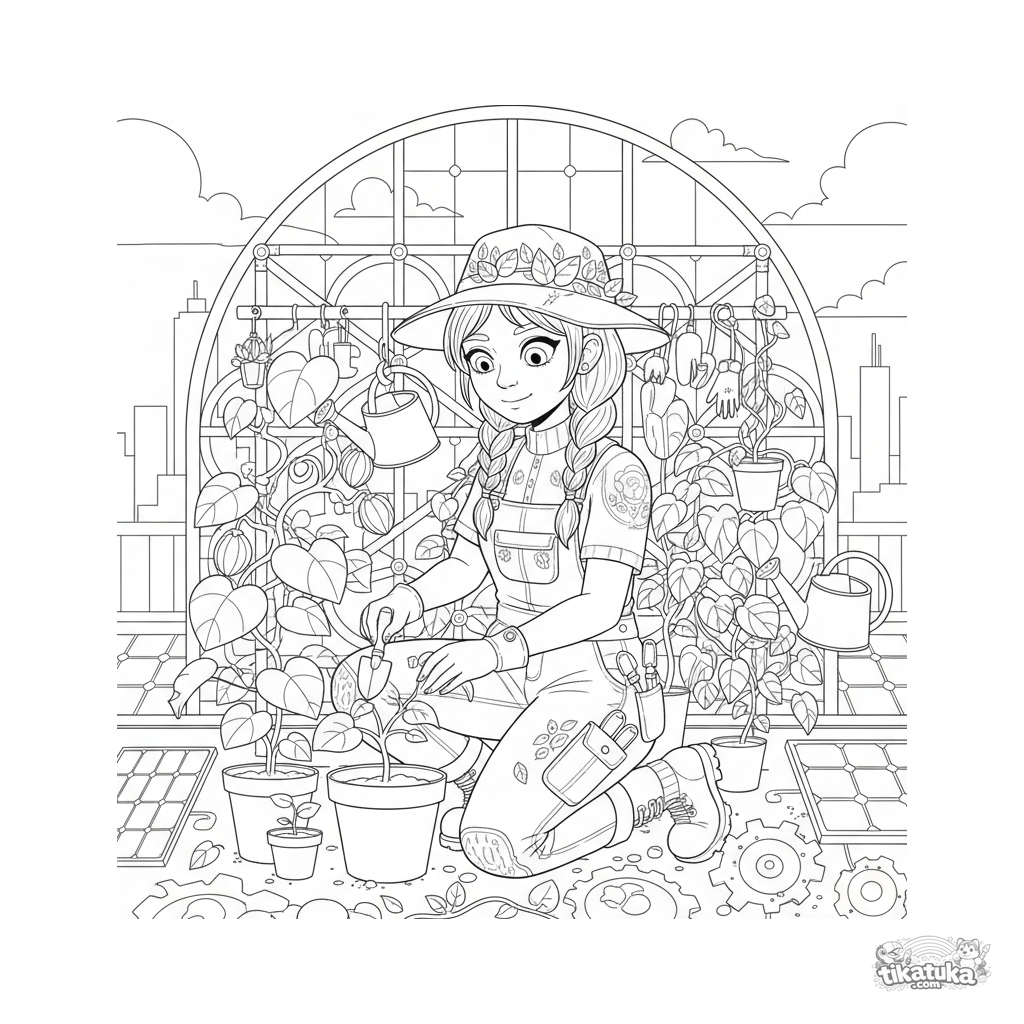 Página para colorir complexa com tema solarpunk para 10-12 anos: uma garota em jardineira funcional cuida de plantas em uma estufa urbana detalhada no telhado.