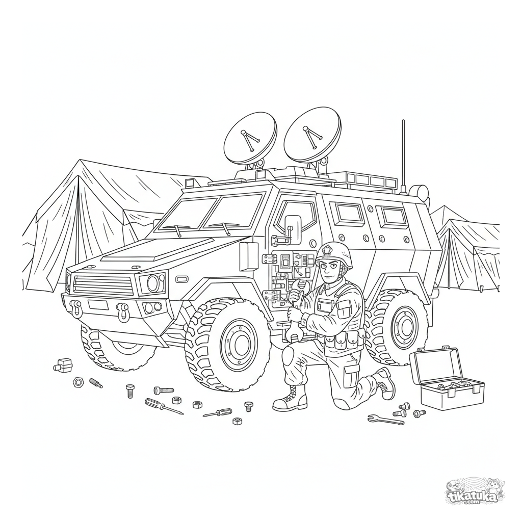 Página para colorir detalhada para 10-12 anos: um soldado consertando um veículo de comunicações em um QG de campo. Muitas ferramentas, painel aberto, barracas ao fundo.