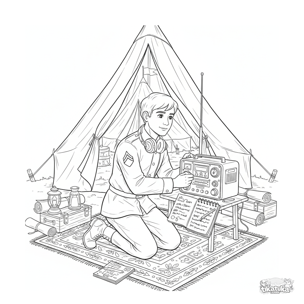 Página para colorir detalhada para 10-12 anos: um soldado operador de rádio monta um rádio de campo dentro de uma barraca de posto de comando.