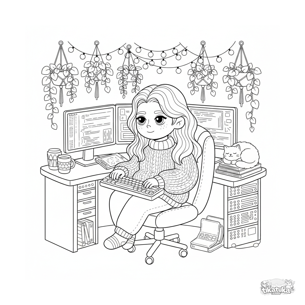 Página para colorir para 10-12 anos: um programador trabalhando em um porão aconchegante cheio de plantas com luzinhas. Detalhes: múltiplos monitores, torre de servidores, gato dormindo.