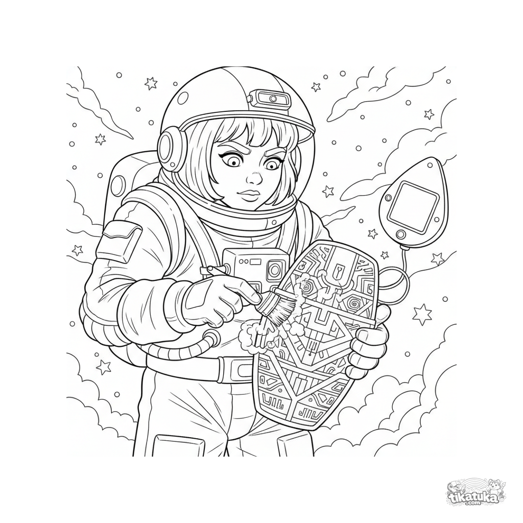 Página para colorir detalhada para 10-12 anos: um arqueólogo espacial no espaço sideral examina um artefato alienígena antigo com uma escova e um scanner.