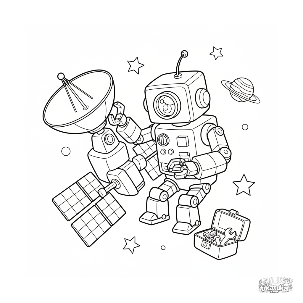 Página para colorir para crianças 7-9: um robô engenheiro blocudo repara uma antena satelital flutuando no espaço sideral entre estrelas. Cena ativa com detalhes.