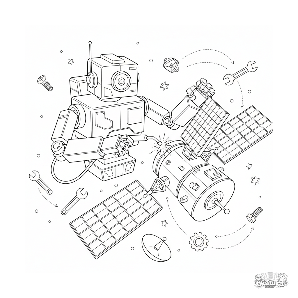 Página detalhada para colorir para crianças mais velhas 10-12 anos: um robô mecânico intrincado consertando um satélite no espaço sideral. Estilo de projeto técnico, muitas linhas.