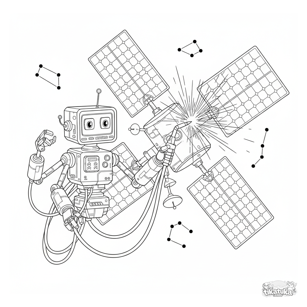 Página para colorir para crianças mais velhas de 10-12 anos: um robô detalhado repara um satélite em órbita.
