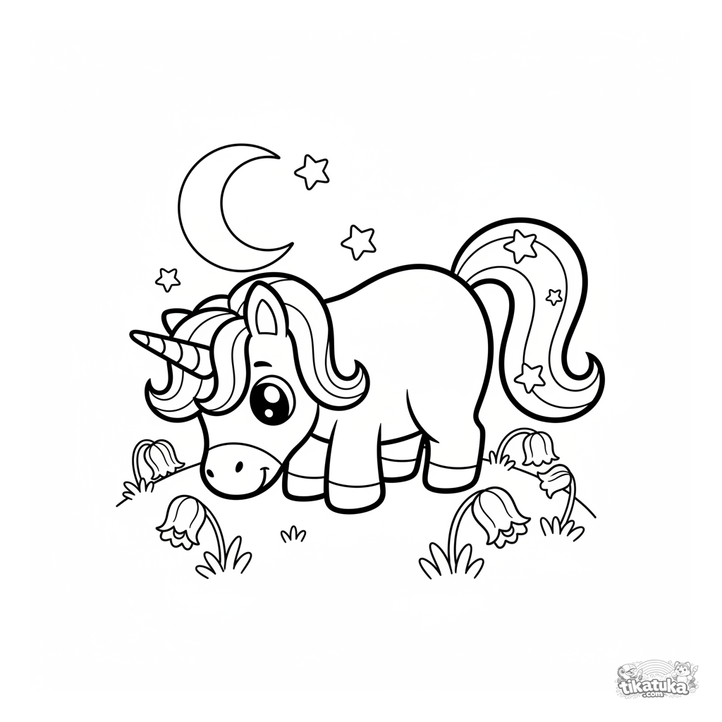 Página simples para colorir de um unicórnio em um campo para crianças de 2-3 anos. Formas grandes, contornos grossos.
