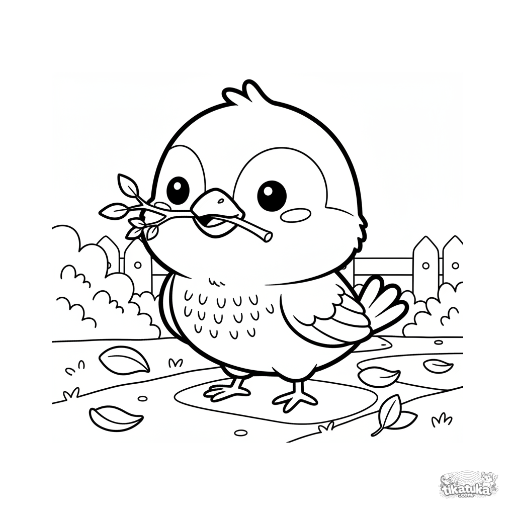 Página para colorir para crianças: um filhote de pardal recolhendo gravetos em um jardim. Cena simples para idades de 4-6 anos.
