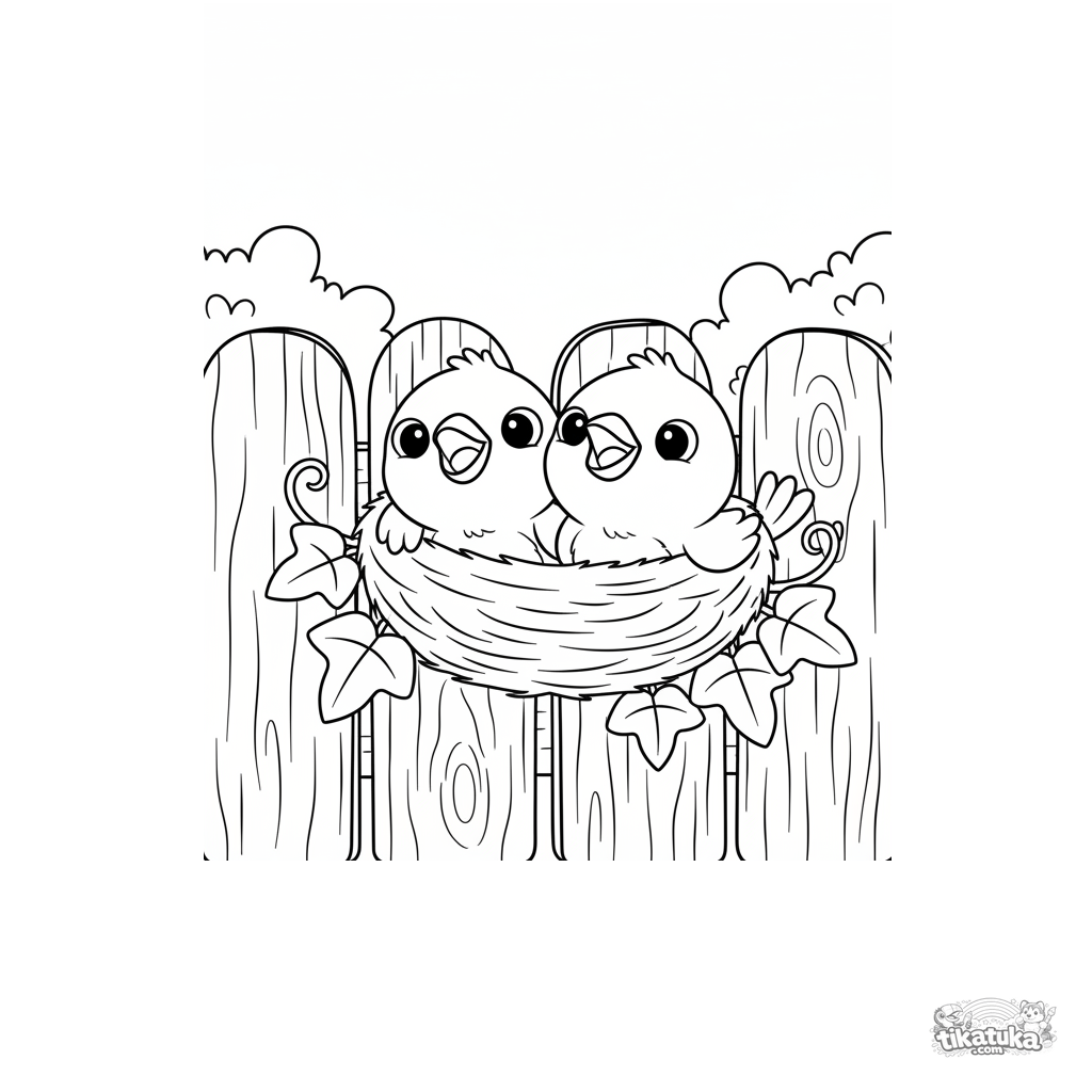 Página para colorir para crianças de 4-6 anos: dois pintinhos de pardal espreitam de um ninho em uma cerca de jardim.