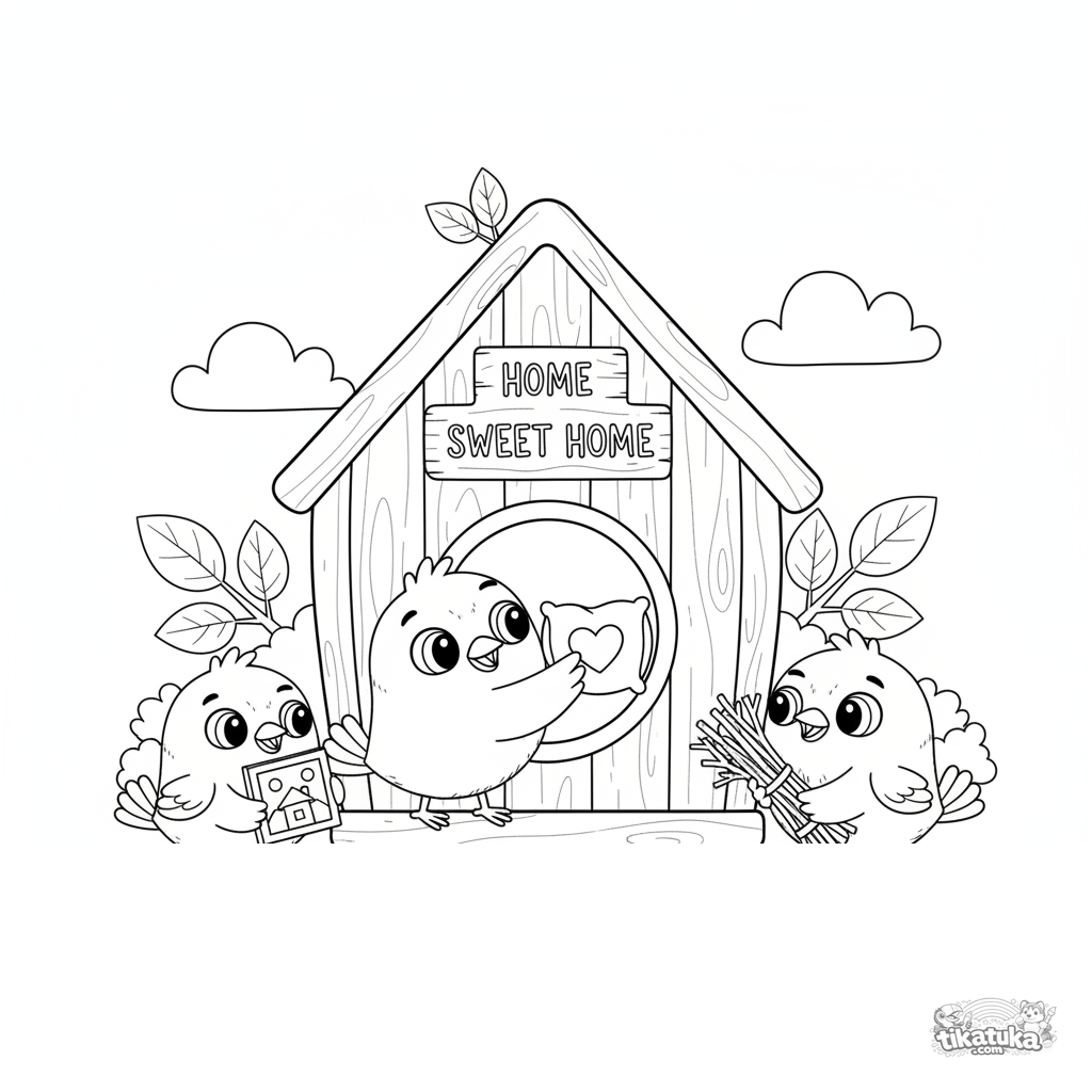 Página para colorir para crianças 4-6: uma família de pardais está se mudando para uma nova casa de pássaros, carregando seus pequenos pertences. Cena doce sobre família e cooperação.