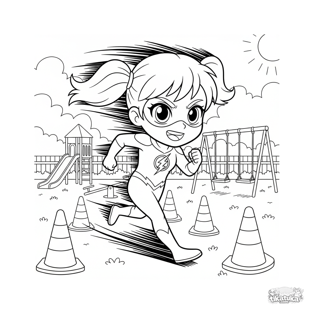 Página para colorir para crianças 4-6: um super-herói da velocidade treina numa pista de obstáculos no pátio da escola, deixando um rastro de desfoque.