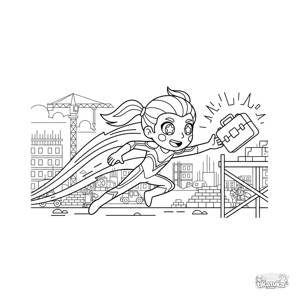 Página para colorir para crianças 4-6: um herói velocidade no estilo de quadrinhos corre por um canteiro de obras para pegar uma caixa de ferramentas. Linhas de movimento.