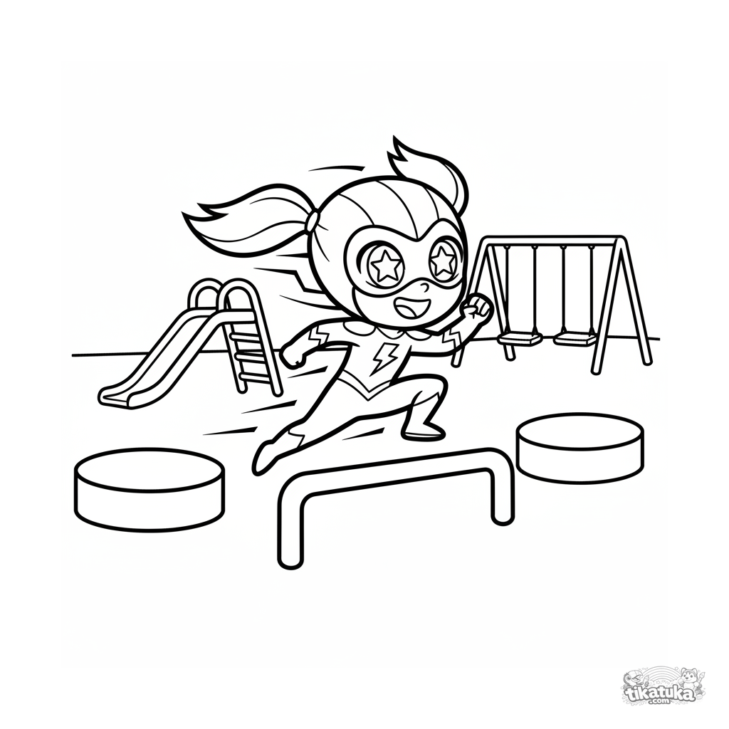 Página simples para colorir para crianças pequenas 2-3: um super-herói da velocidade corre por um circuito de obstáculos no playground da escola. Formas grandes.
