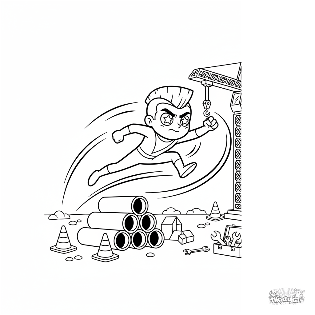 Página para colorir para 7-9 anos: um super-herói com supervelocidade corre por um canteiro de obras, desviando de obstáculos. Cena energética.