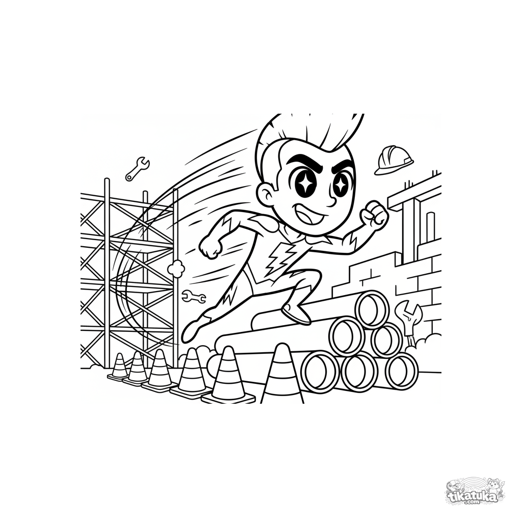 Página para colorir para pré-adolescentes 7-9: um super-herói da velocidade treina em um circuito de obstáculos montado em um canteiro de obras com cones e tubos.