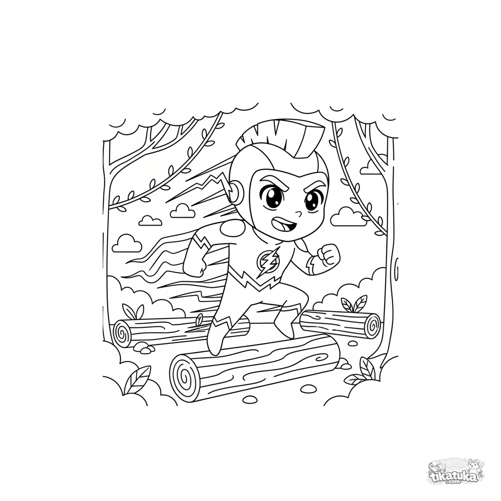 Página para colorir para pré-adolescentes 7-9: um super-herói da velocidade em traje aerodinâmico percorre uma pista de obstáculos na floresta, deixando um rastro de luz.