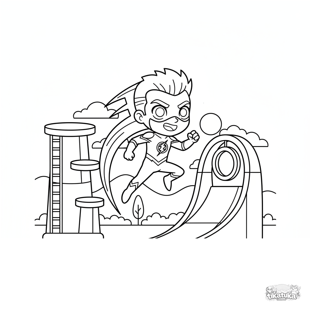 Página para colorir para crianças 7-9: um super-herói da velocidade salta através de um circuito de obstáculos colorido ao ar livre.