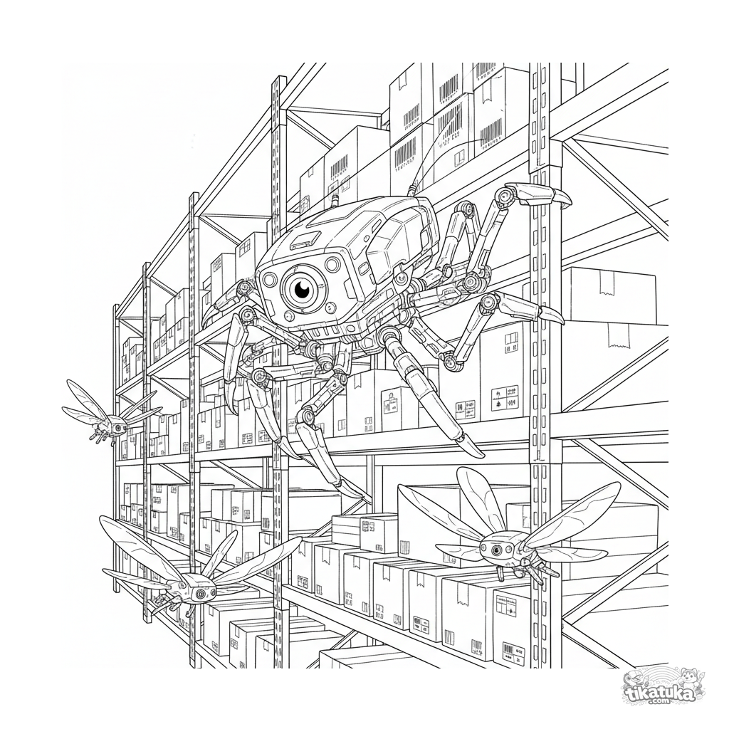Página para colorir técnica complexa para crianças mais velhas de 10-12 anos: um robô aranha de múltiplas pernas sobe prateleiras de armazém até o teto e escaneia códigos de barras em caixas, com drones voando abaixo nos corredores.