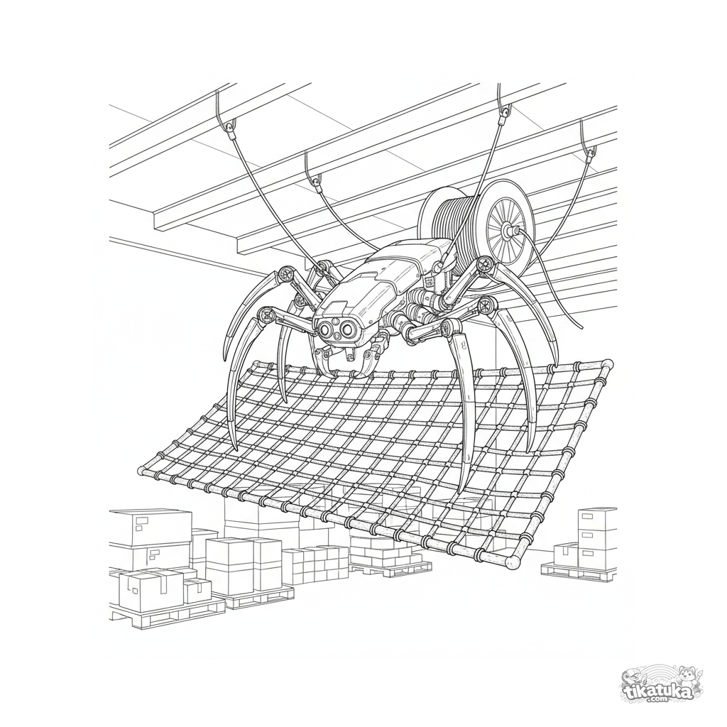 Página para colorir complexa para crianças mais velhas 10-12: um robô aranha elegante, suspenso por vigas do teto do armazém, tece uma rede de segurança com cabo. Detalhes técnicos e perspectiva.