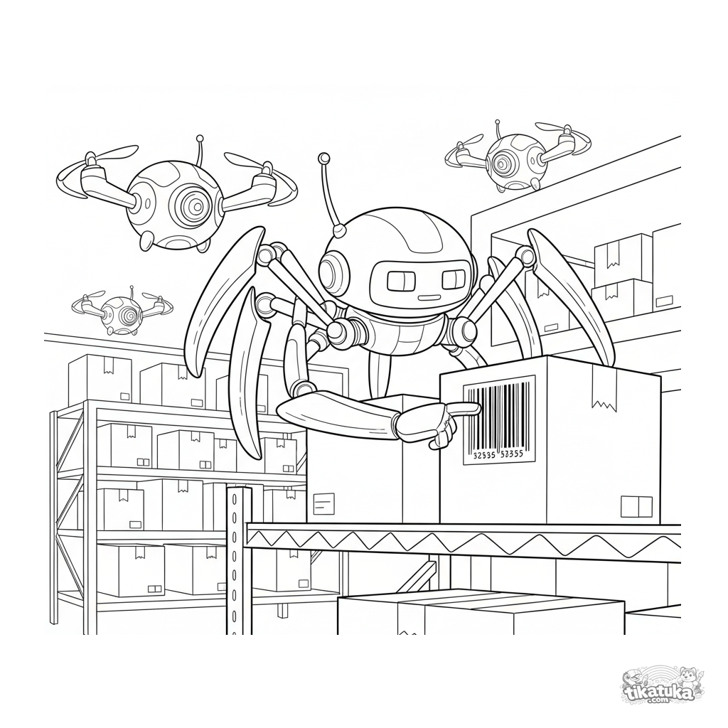 Página para colorir para pré-adolescentes 7-9: um robô aranha de múltiplas pernas com uma cúpula de câmera escaneia um código de barras em uma caixa em uma prateleira alta de armazém, com drones pairando ao fundo. Detalhe moderado.