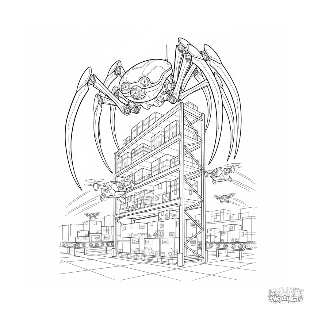 Página para colorir complexa em estilo técnico: um mech-aranha em uma prateleira escaneia um armazém com drones. Para crianças de 10 a 12 anos.