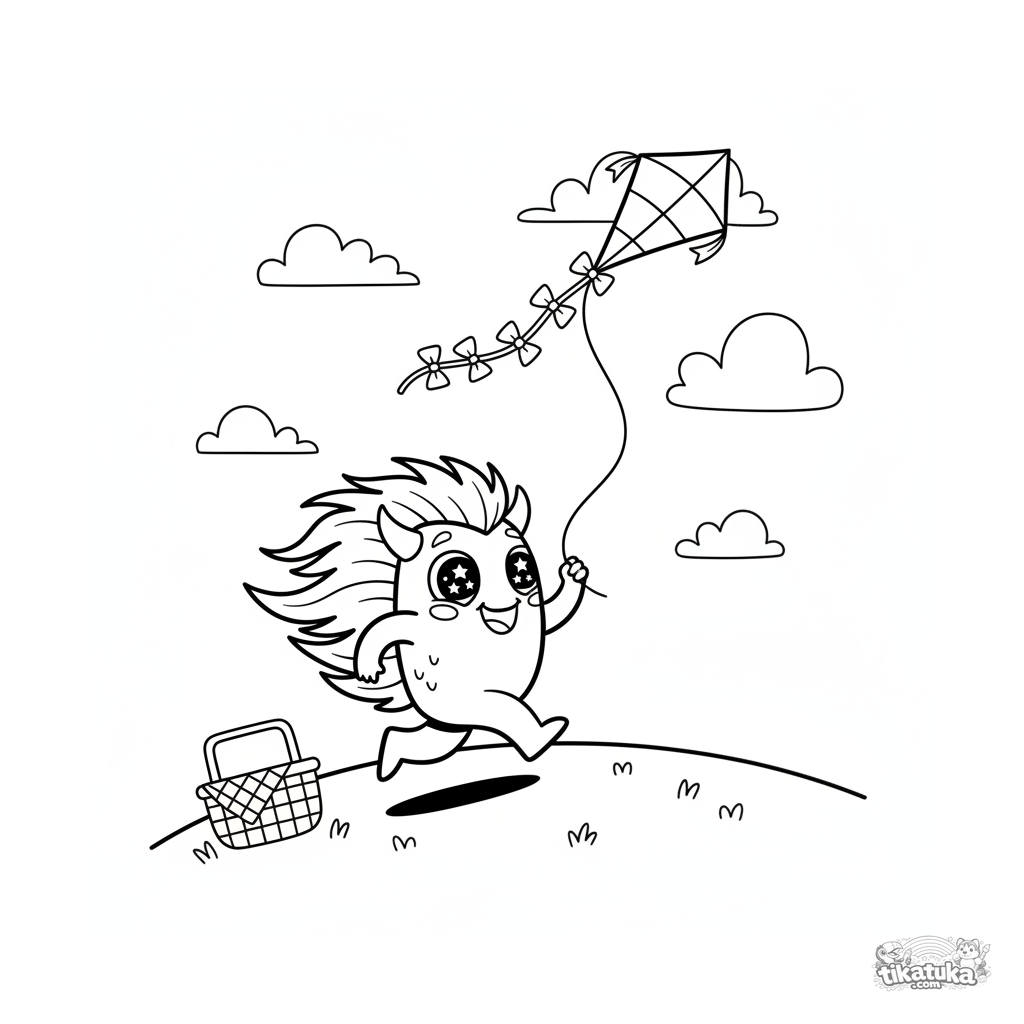 Página para colorir para crianças de 4-6 anos: um monstro espinhoso alegre corre colina acima soltando uma pipa listrada em um piquenique. Cena dinâmica.