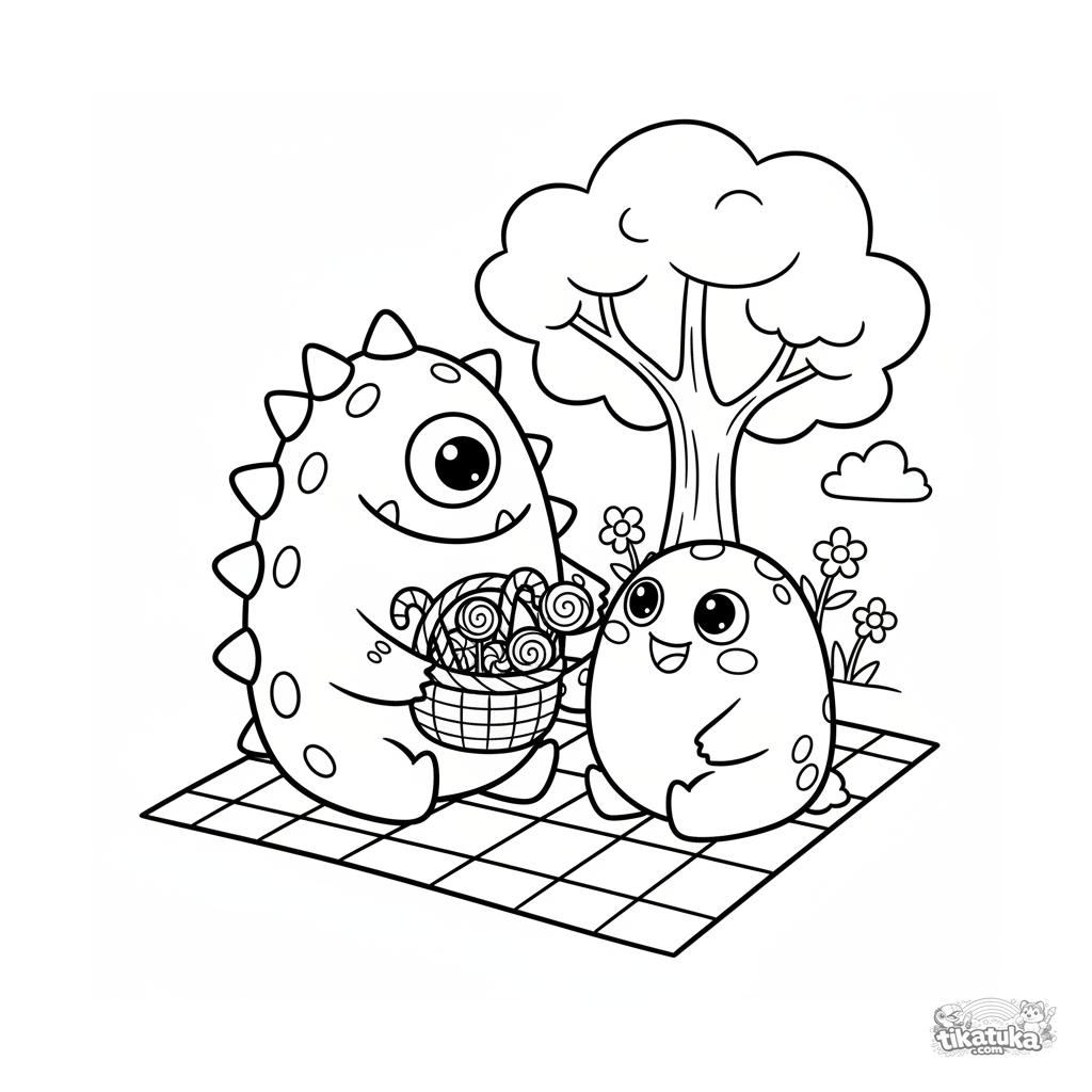Página para colorir para crianças de 4 a 6 anos: um monstro espinhoso compartilha uma cesta de doces com um amigo em um piquenique. Cena de amizade com dois personagens.