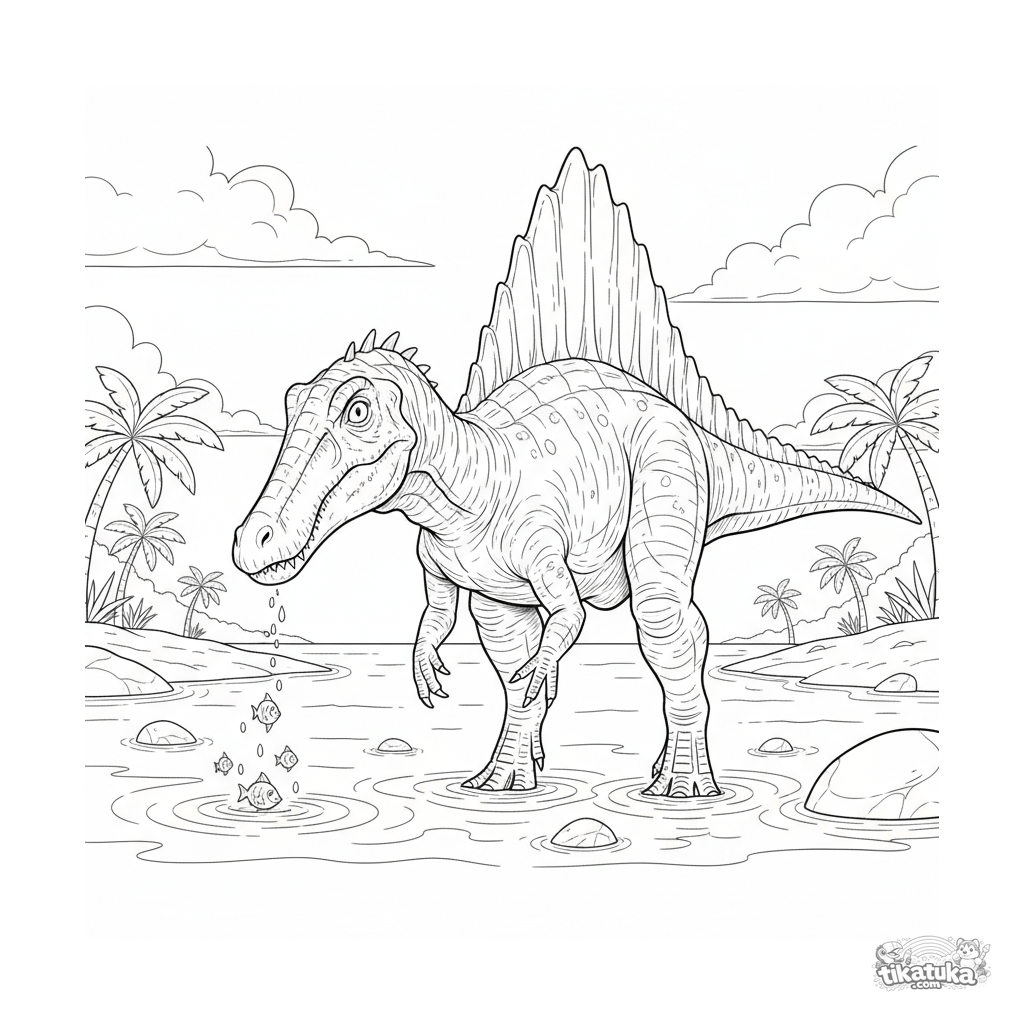 Página intrincada para colorir para crianças 10-12: um espinossauro realista com uma vela nas costas pesca nas águas rasas de uma praia de areia de oceano antigo.