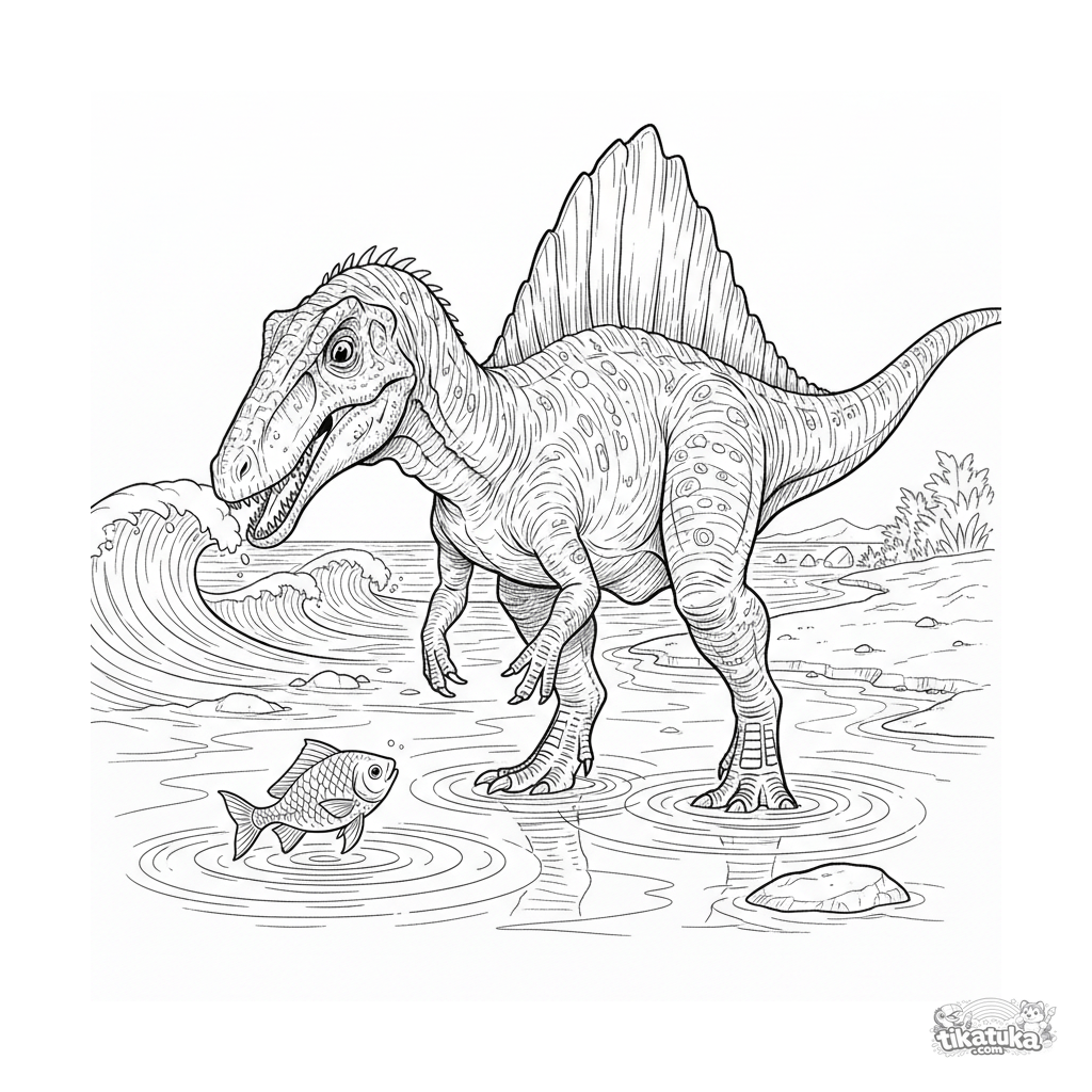 Página para colorir para crianças mais velhas 10-12: um espinossauro pescando em águas rasas numa costa oceânica antiga. Ilustração naturalista detalhada.